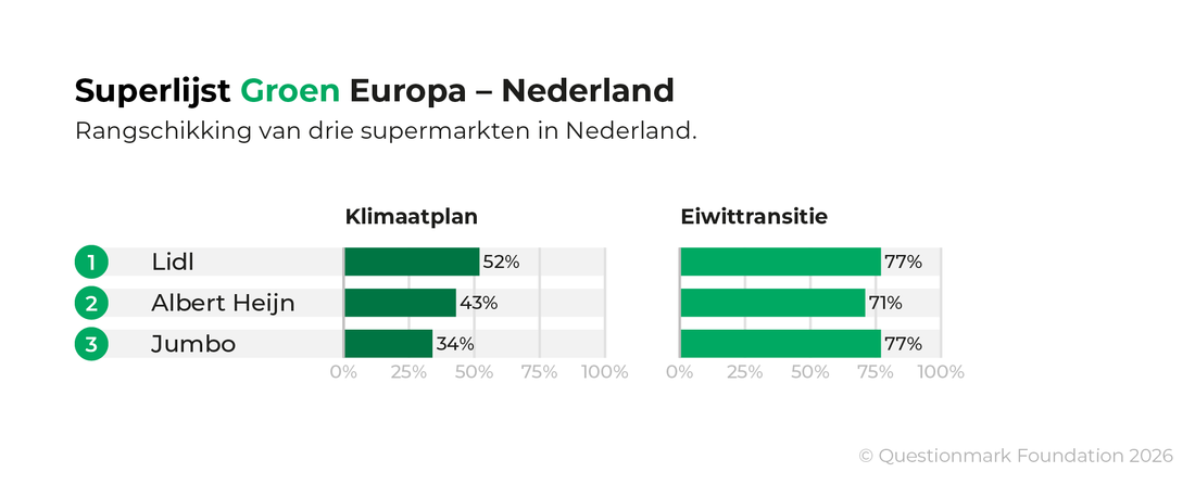Superlijst Groen Europa 2026 vergeleek de duurzaamheidsdoelstellingen van 27 Europese supermarkten in acht landen. Lidl presteert in alle onderzochte landen beter dan de lokale concurrenten. Samen met Albert Heijn en Jumbo behoort het tot de best presterende supermarkten van deze Superlijst. In totaal hebben zeven supermarkten een gedetailleerde klimaatroutekaart gepubliceerd: Lidl (DE, NL, ES, PL), Albert Heijn en Carrefour (FR, ES). Ook geven zeven supermarkten - Albert Heijn, Jumbo, Lidl (DE, NL), Migros, Rewe en Tesco - financiële ondersteuning voor hun leveranciers om emissiereducties in de gehele keten te realiseren. Acht supermarkten hebben een plantaardig eiwitdoel gepubliceerd, waarvan vier doelen hebben in lijn met het Planetary Health Diet: Albert Heijn, Lidl (NL en PL) en Jumbo. Andere supermarkten nemen wat voorzichtigere stappen op dit thema. Negen supermarkten zetten nog geen stappen op de eiwittransitie.